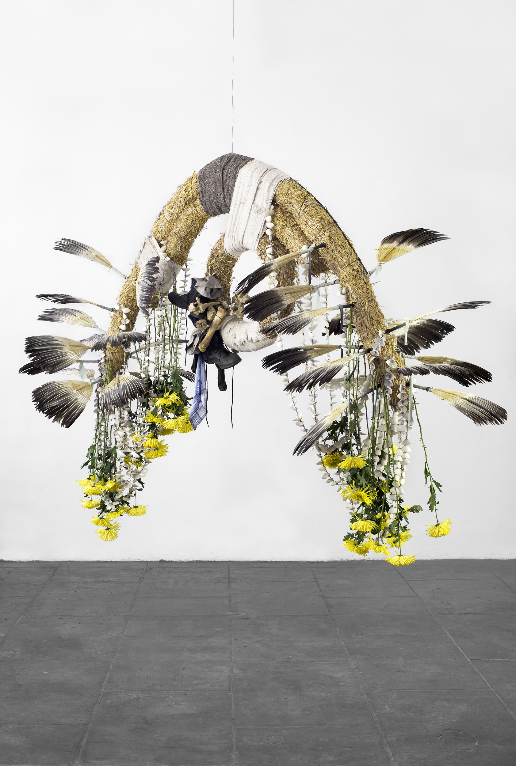 2016 Heno , textil, plumas, crisantemos, calzados, huesos 300 x 300 x 110 cm