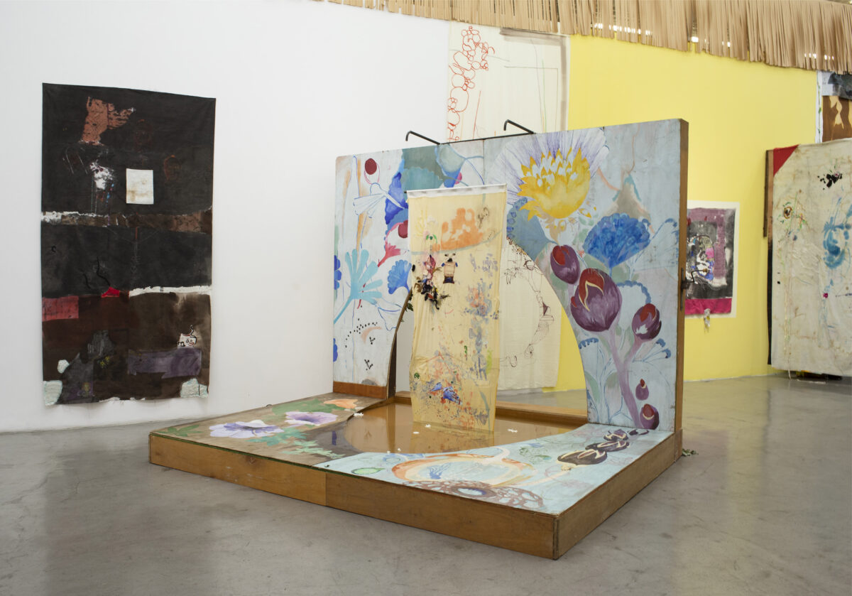 2014 Bordado y acrilico sobre tela de algodón. Latex, acrilico y óleo sobre fenolico. Sistema de polea, fibra de vidrio y resina. Hoja de laurel y eucalipto, caramelos media hora y fruto del loto. 240 x 317 x 230 cm
