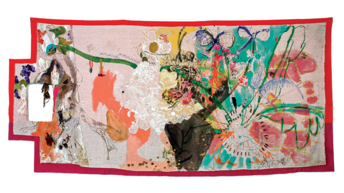 2004-2008 Acrílico, óleo, birome, cauries, cáscara de bananas, monedas y bordado sobre tela de algodón 135 x 190 cm