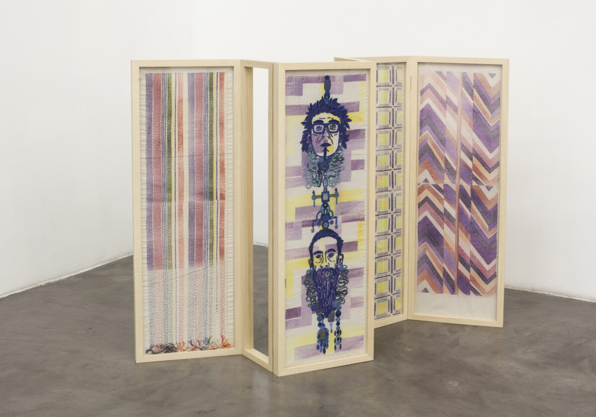2017 Bordado a mano con hilos de algodón sobre tela estampada por sublimación y biombo de madera Medidas variables