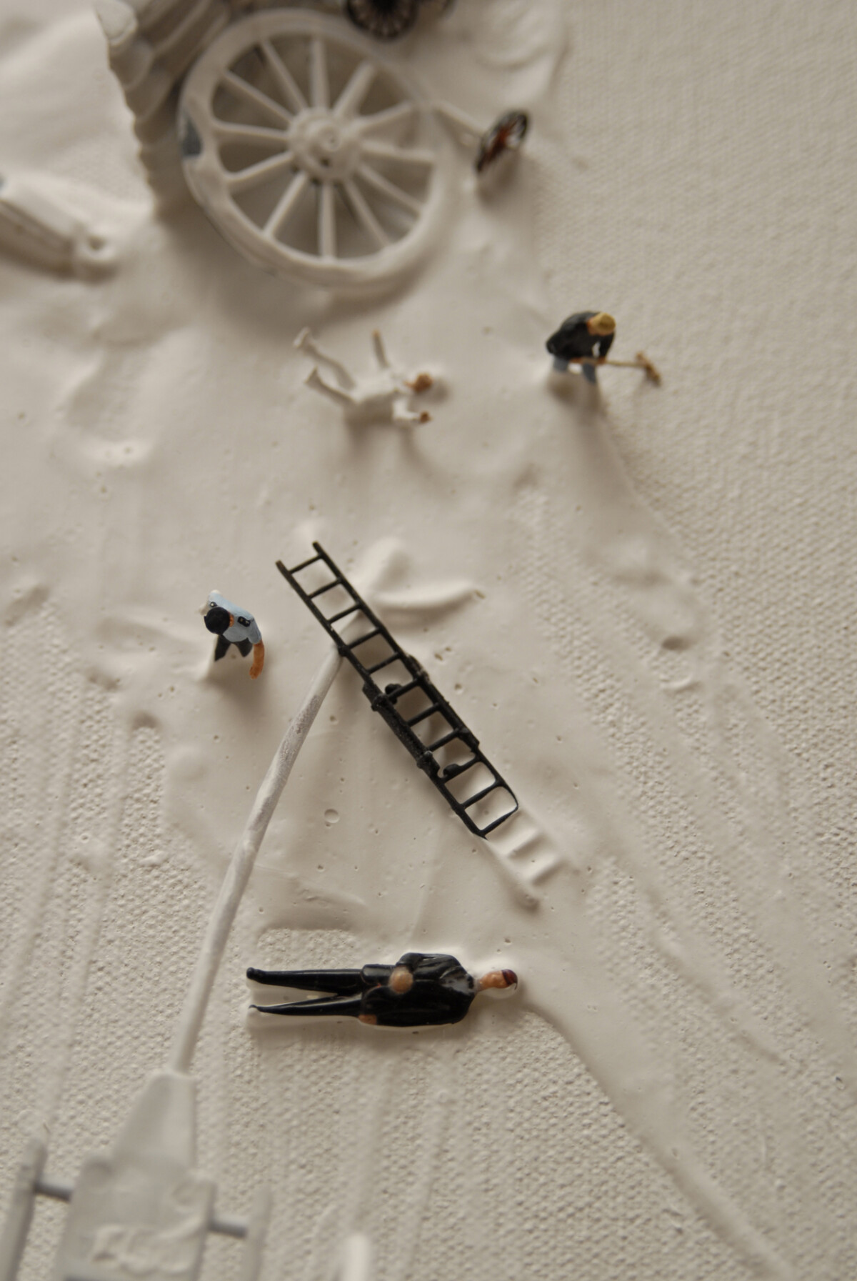 2008 (4 paneles y 1 estante de madera), Acrílico, grafito, figurilla, cuerda y estante sobre lienzo 152 x 452 x 27 cm (detalle)