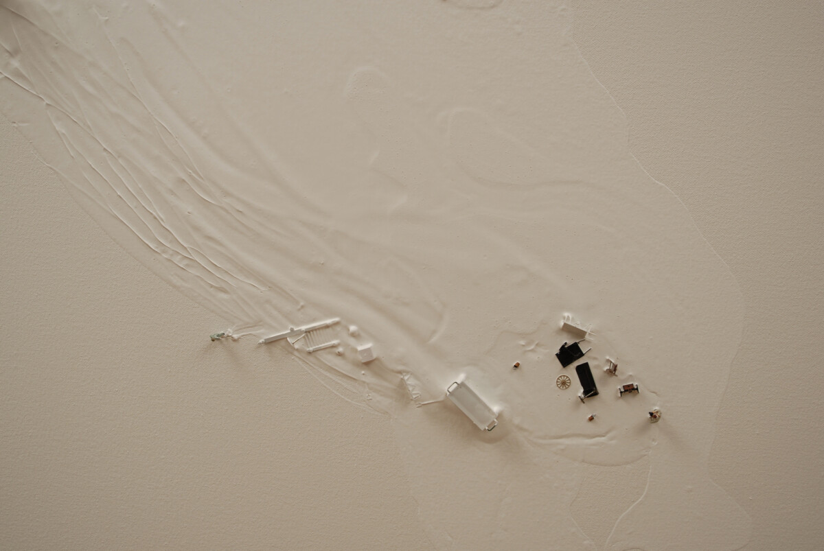 2008 (4 paneles y 1 estante de madera), Acrílico, grafito, figurilla, cuerda y estante sobre lienzo 152 x 452 x 27 cm (detalle)
