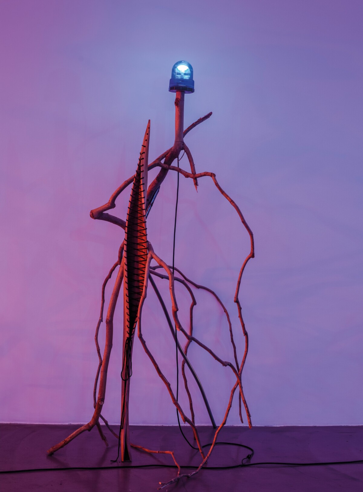 2018 Rama, hierro, vaina vegetal y cordón negro, baliza giratoria con luz led 195 x 50 x 50 cm. (Disponible)