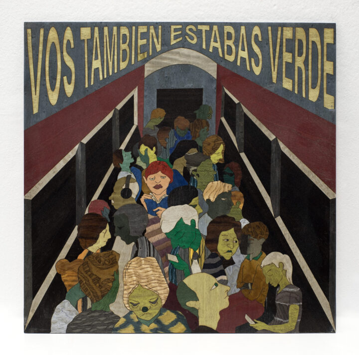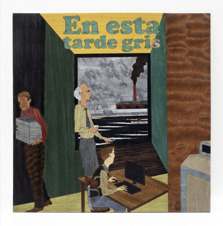 Sin forzar la simetría, tres o cuatro ejemplares de revistas podrían cerrar el hipotético recorrido. La serie de tapas de novelas gráficas en marquetería que Gordín inició en 2007 dan espesor literal a sus dibujos, revisitando una vez más viejas colecciones de revistas -Weird TalesFantastic Mysteries, Amazing Stories- con diseños propios. Las acuarelas de 2004 en las que Gordín presentaba sus propias historias asombrosas (y sus misterios fantásticos y sus cuentos raros) cobran mínimo relieve en el trabajo con láminas de madera. La imaginación se deja llevar aquí por la paleta multicolor del jacarandá, el maple, el palisandro, las raíces del mirto, el laurel o el fresno, y sigue las aventuras de un personaje recurrente. Un fantasma desarrapado, mezcla de poeta decadentista y Wally espectral, toca un serrucho en una orquestina, es arrastrado hacia el fondo del mar por dos sirenas, o simplemente mira hacia atrás. En la escultura plana, Gordín encuentra una nueva economía de materiales y volúmenes para dar cuerpo a sus relatos fantásticos nunca narrados.