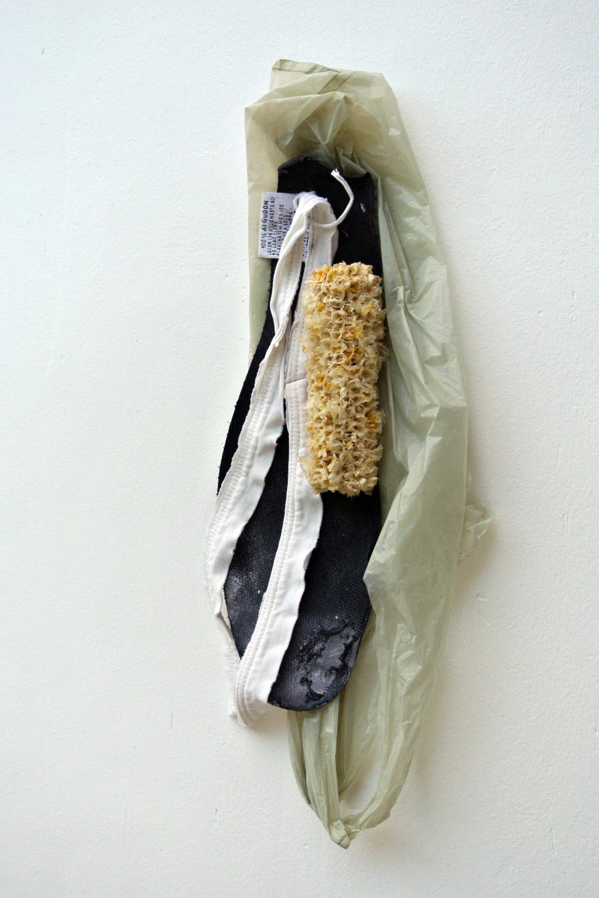 2008 Nylon bag, slipper insole, T-shirt collar, corn husk 35 x 11 x 4.5 cm