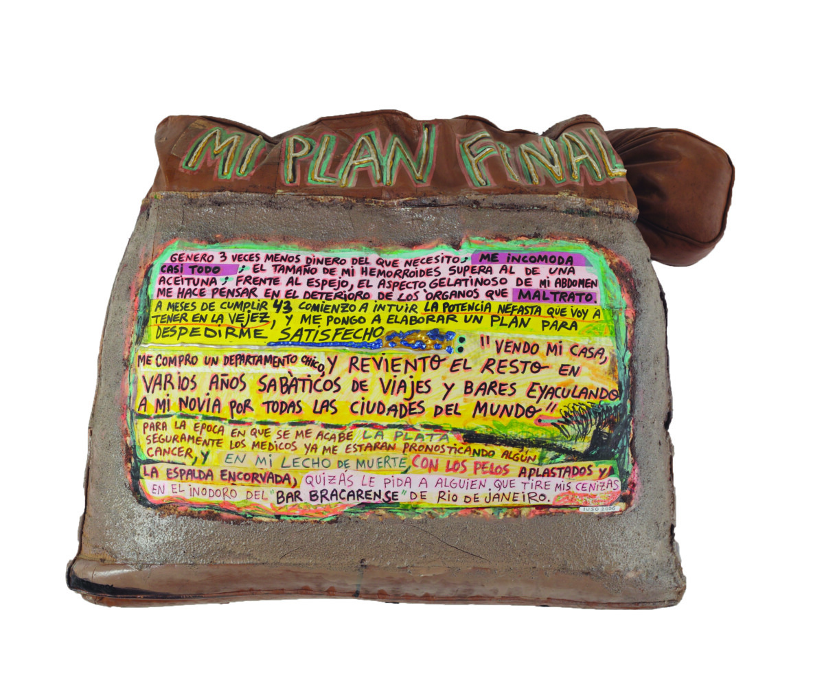2006 Synthetic enamel, embossing paint, indelible marker, ballpoint pen and coffee grounds on leather 77 × 96 × 27 cm