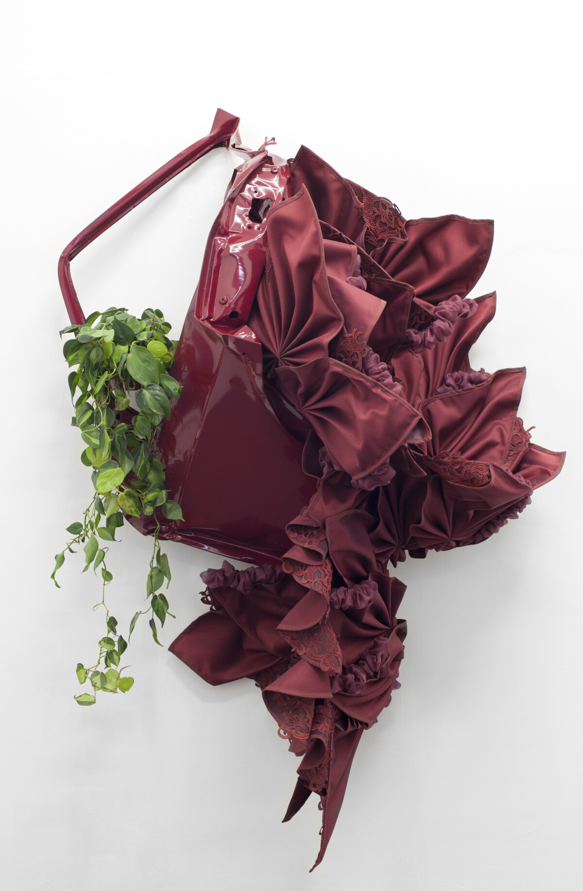 2020 Crashed car door with restored paint, fabric volumes, plant. 175 x 100 x 70 cm (Disponible)