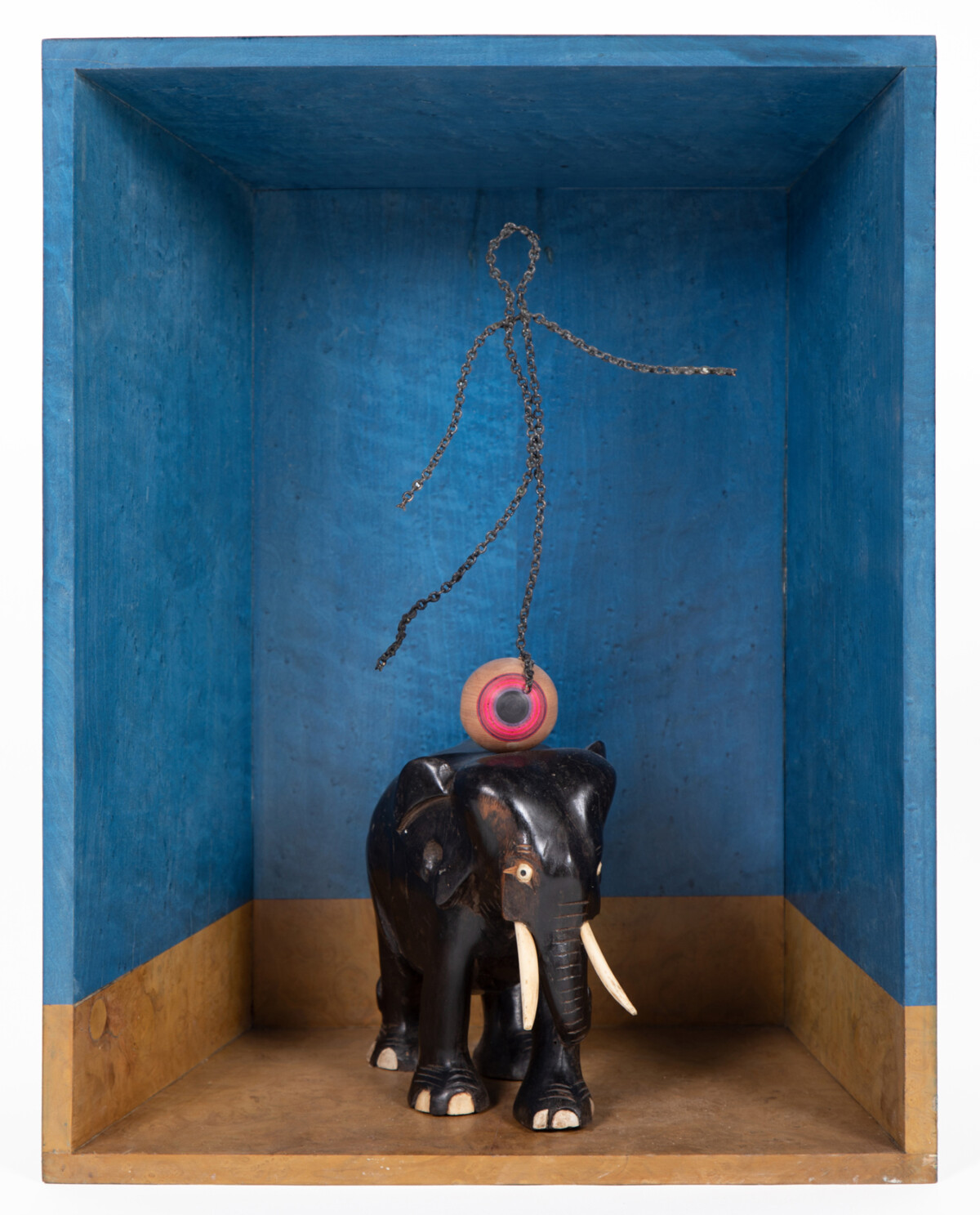 2020 Wood and ivory elephant, plywood, veneered wood, bronze chain and oil painting. bronze chain and oil painting. 45 x 34 x 20 cm (Available)