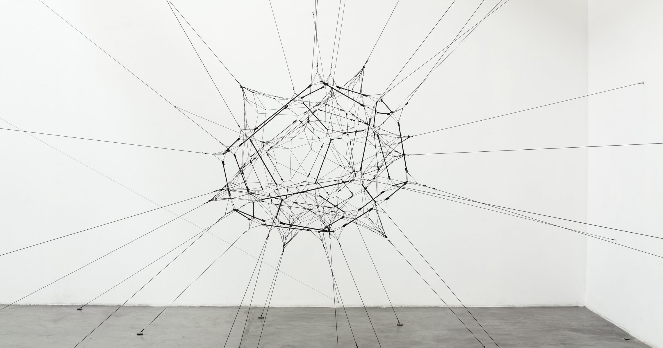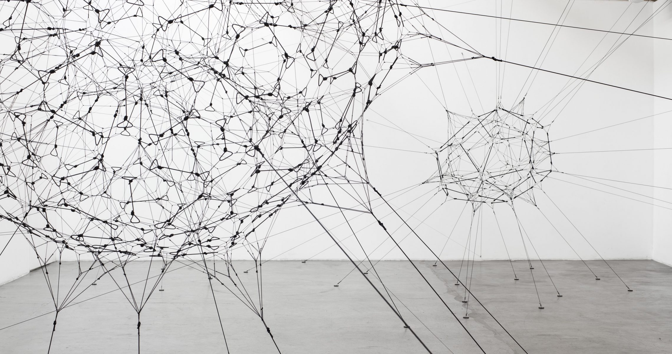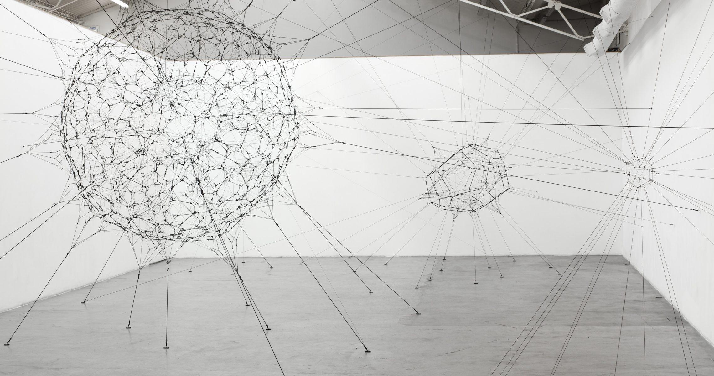 Nourished by the fields of art, architecture, astrophysics, and the natural and social sciences, Tomás Saraceno’s artistic practice unfolds as a sequence of traces, paths, and constellations that reveal the relationships binding the microscopic, the global, and the cosmic. The sculptural works Zonal Harmonics, composed of orbits sustained solely by their mutual tension, speculate on the variations of velocity and geometry in the trajectories of celestial bodies and their interrelations in space and time. The physical dynamics conveyed by these works extend from microscopic particles to planetary gravitational forces.