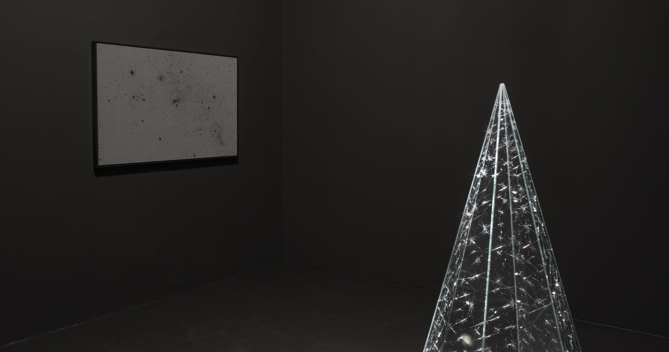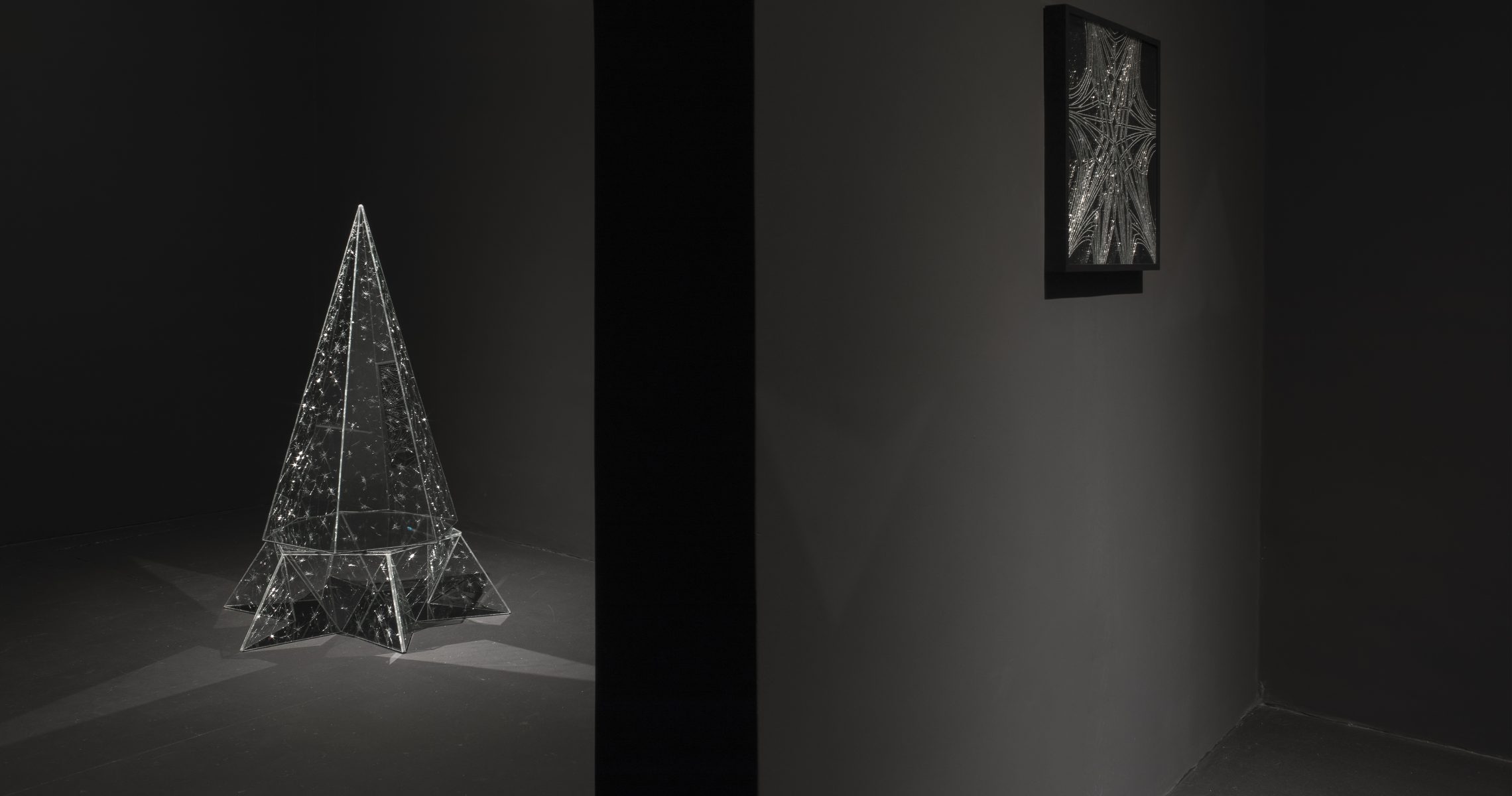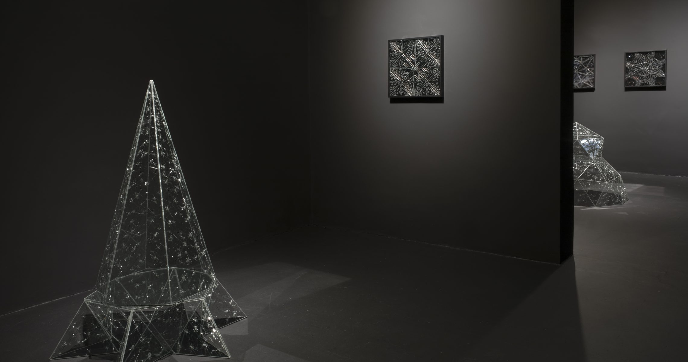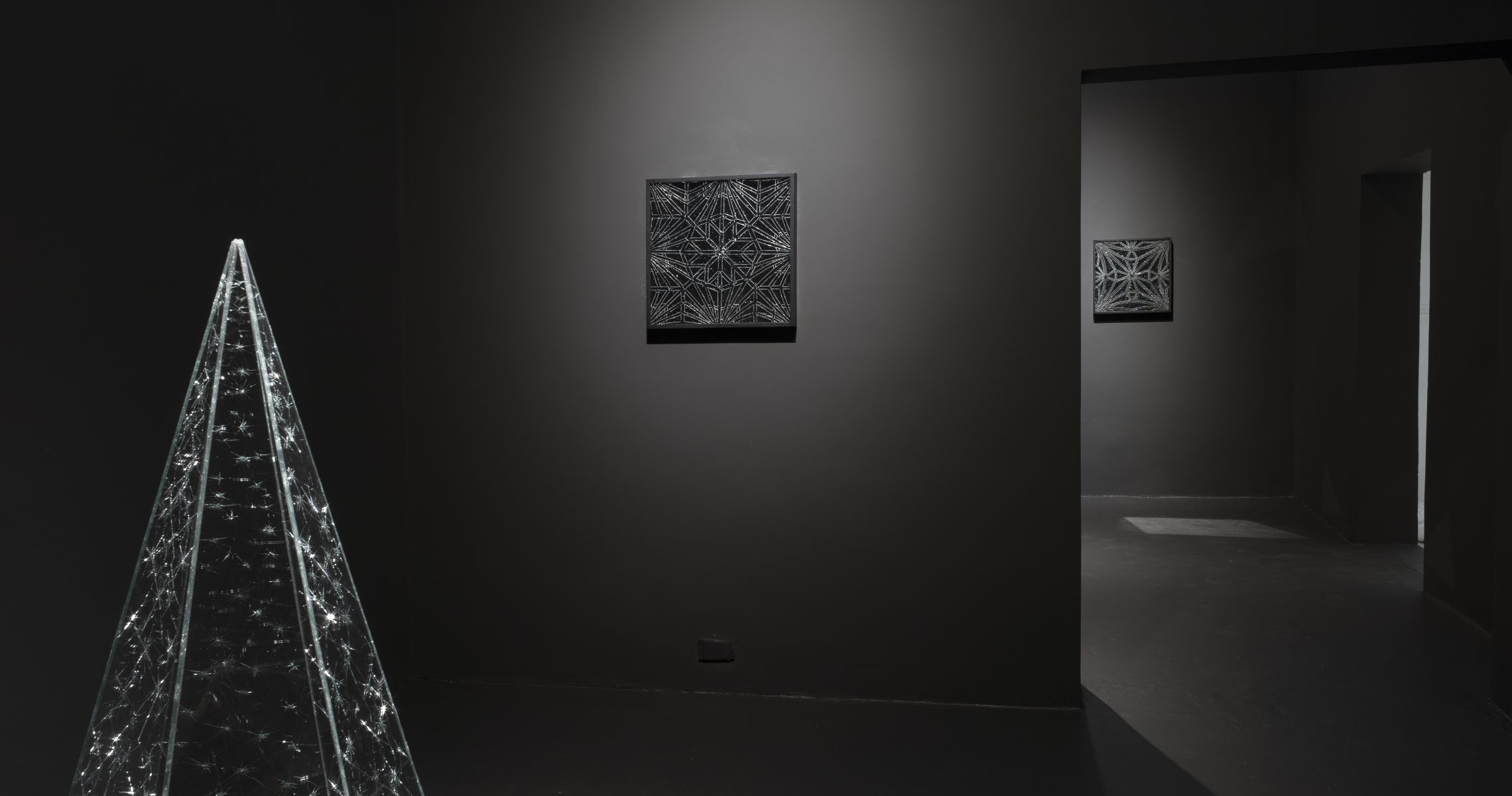 Two dark rooms, where the hammered glass of two sculptures with sacred overtones sketches stars that shine and reflect throughout the space. Both works are composed of multiple triangles — a geometric form taken by various religions as a metaphorical representation of divinity.