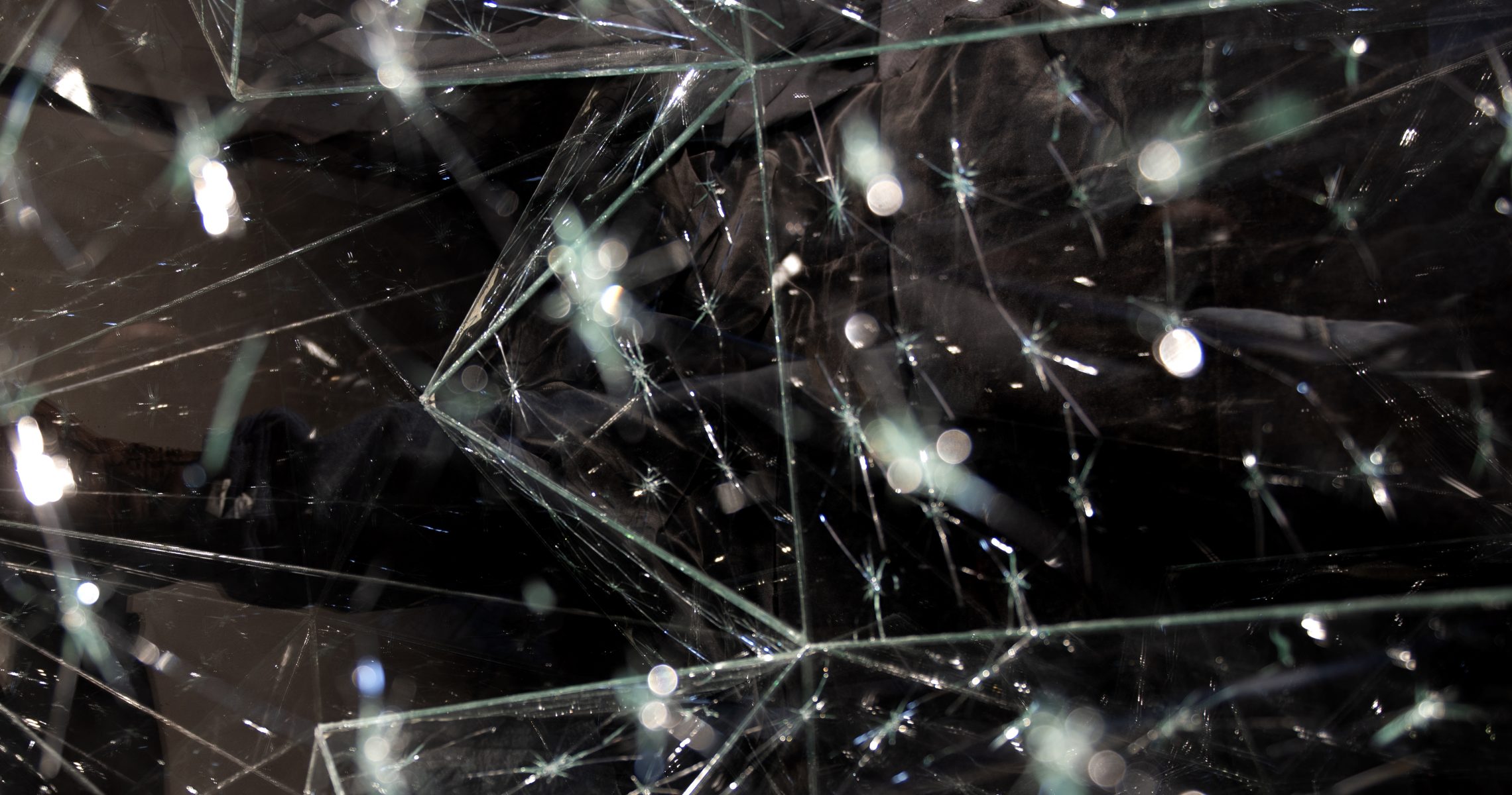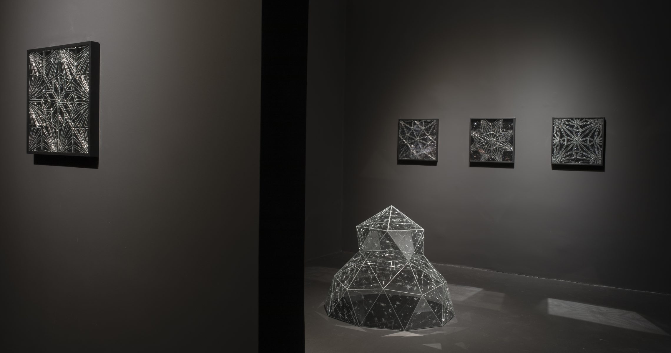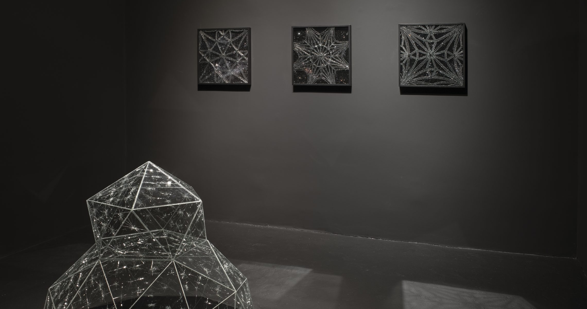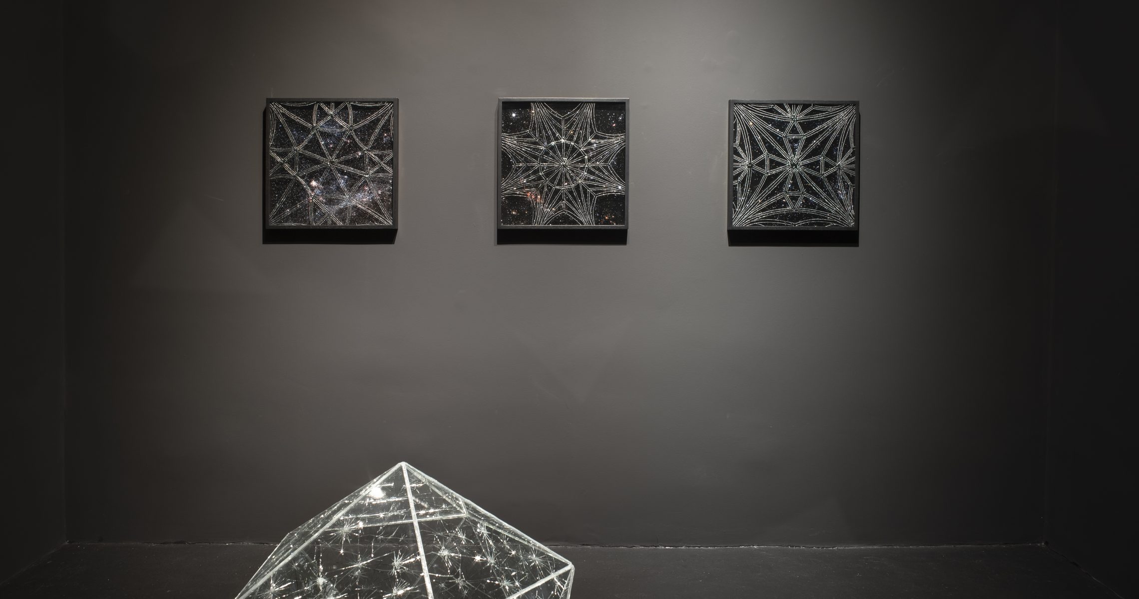 Two dark rooms, where the hammered glass of two sculptures with sacred overtones sketches stars that shine and reflect throughout the space. Both works are composed of multiple triangles — a geometric form taken by various religions as a metaphorical representation of divinity.