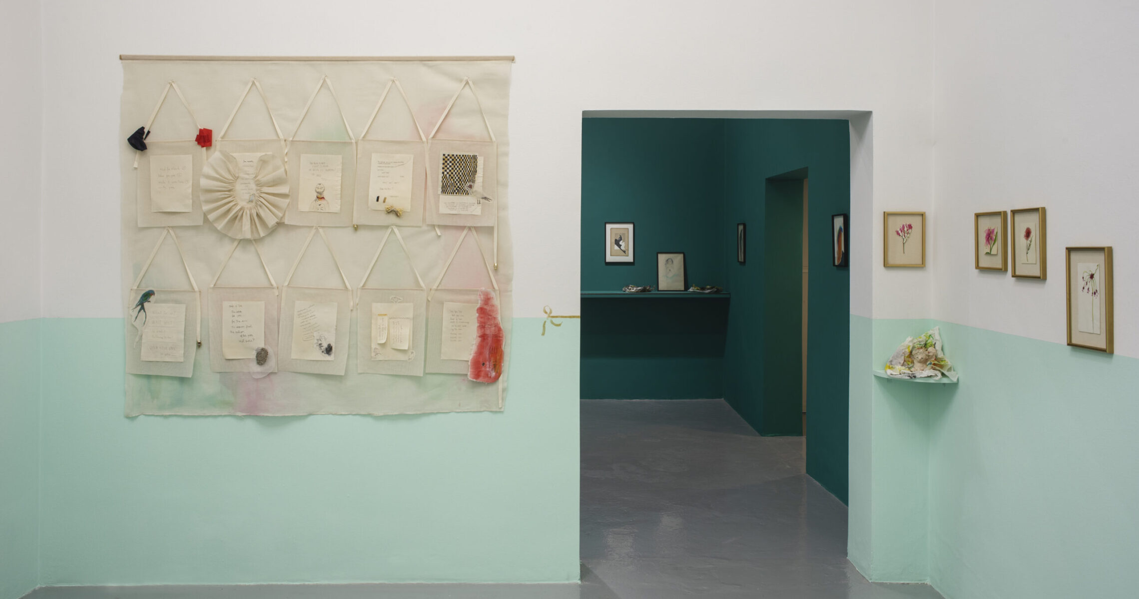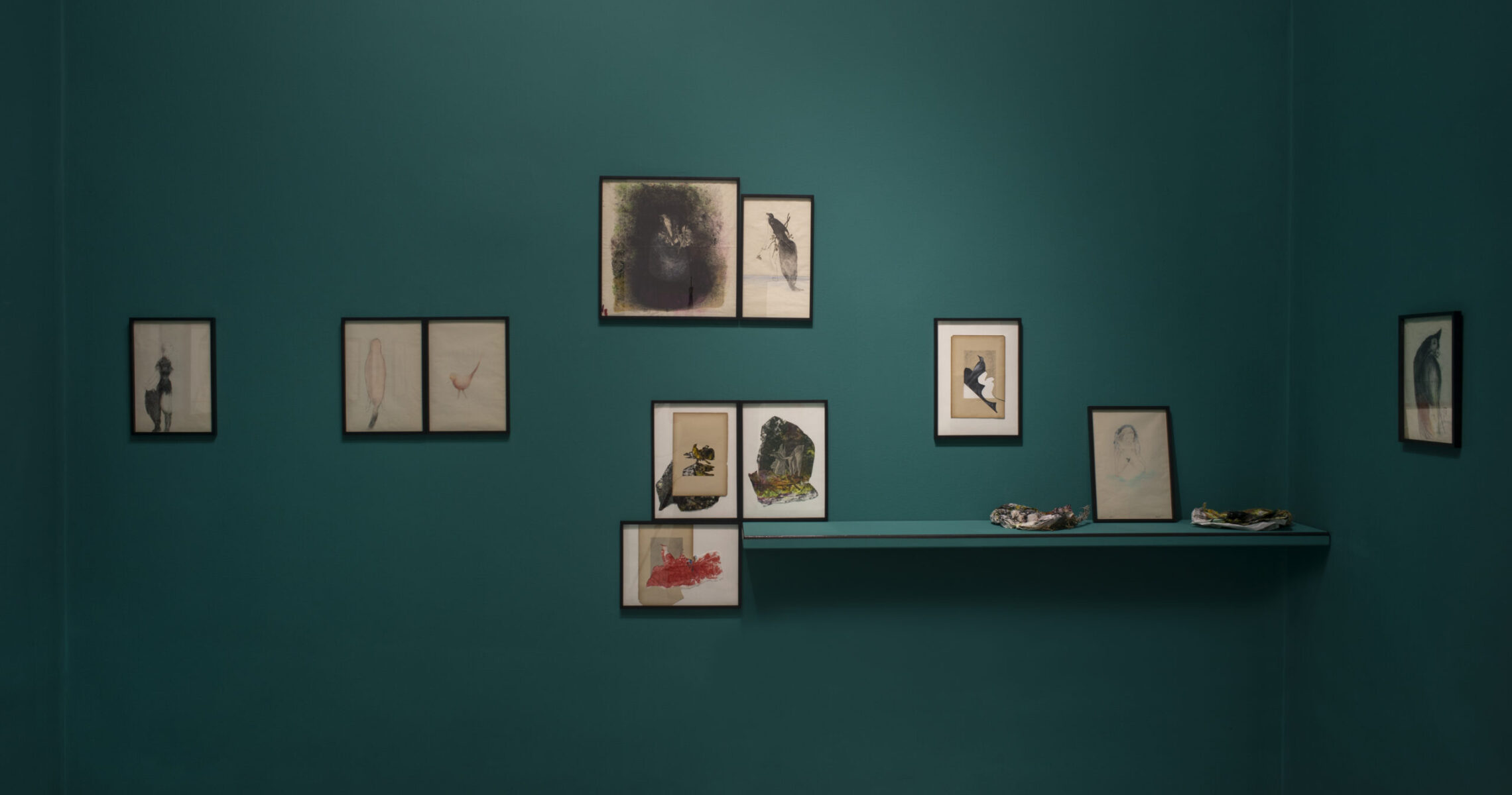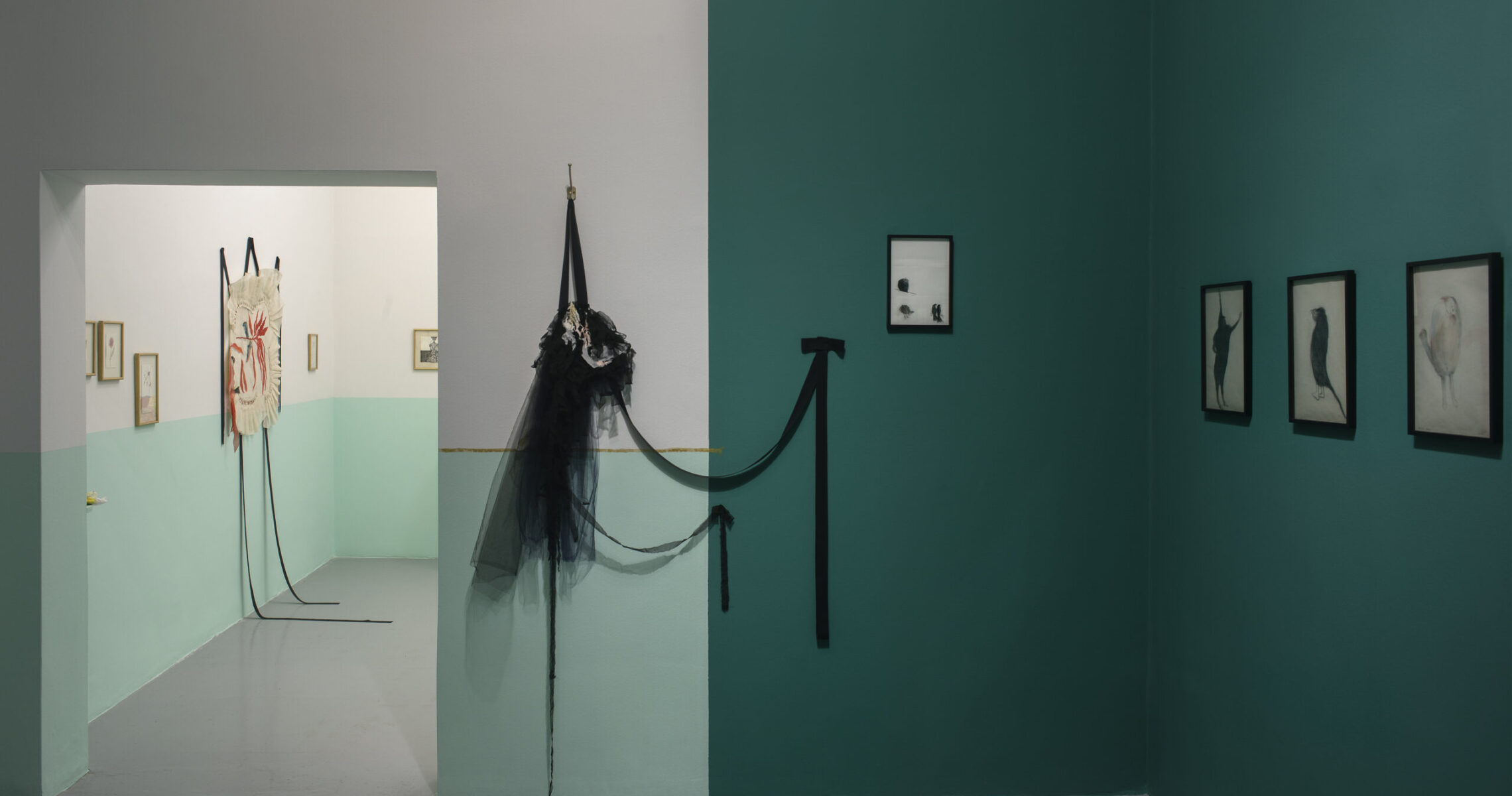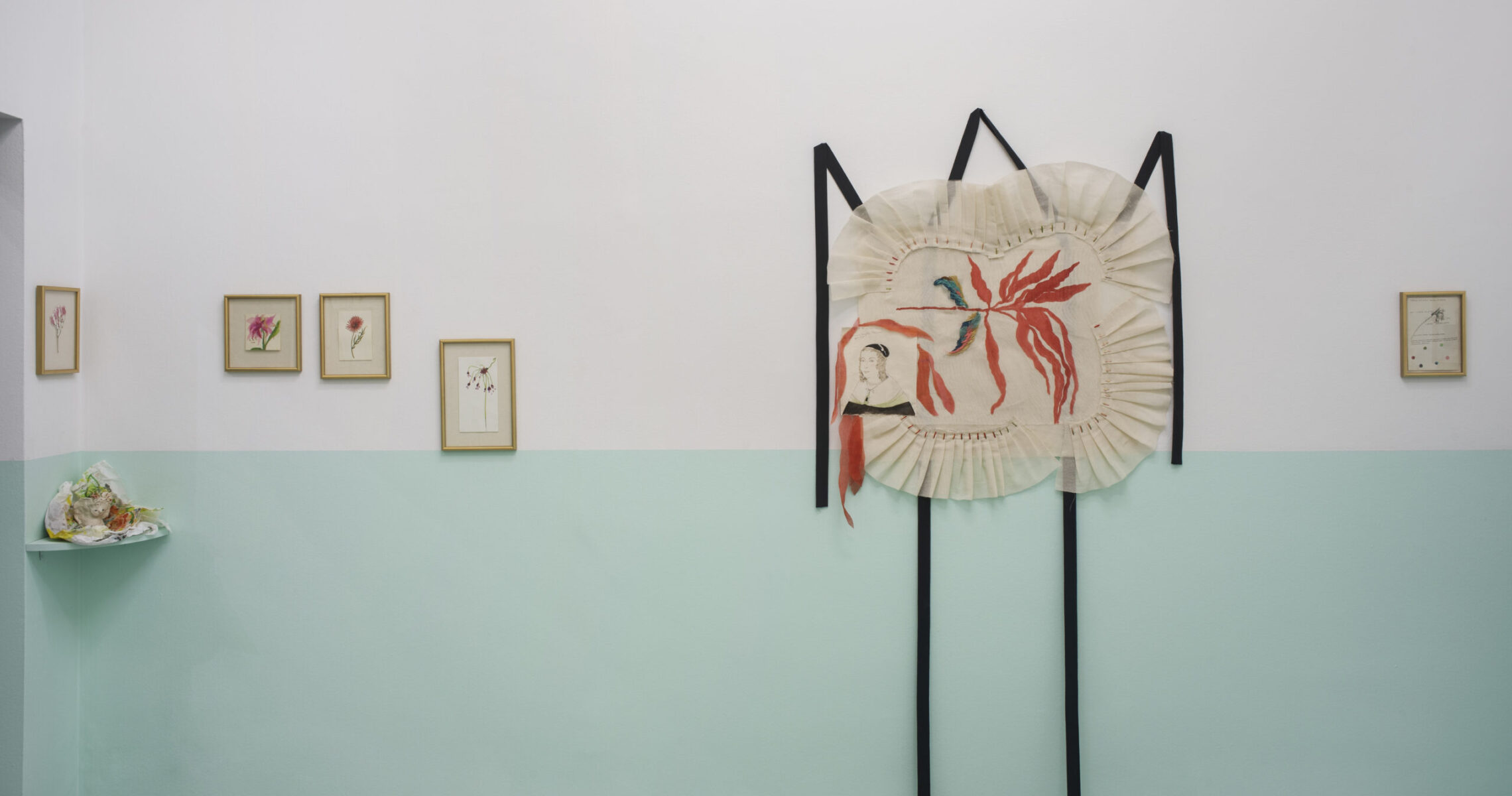 With that boldness, she draws us into the tempestuous realms (literary, historical, visual, alchemical…) that she in- habits and that inhabit her, composing from bits and piec- es, cutouts, scraps of tarlatan, small objects—and also from words and books. She collects, gathers, and composes, laugh- ing at linear or chronological coherence: a drawing made many years ago that had never been shown finds its little paper bird today. Displacing the coordinates of the world and our perception, she takes us on a journey through inno- cent little flowers that sometimes get very hot, finely drawn bird-women, fingers that sketch out a quiet fuck you, and cloths/aprons with hand-written phrases that, rather than becoming slogans, invite us to walk the edge of (non)sense…