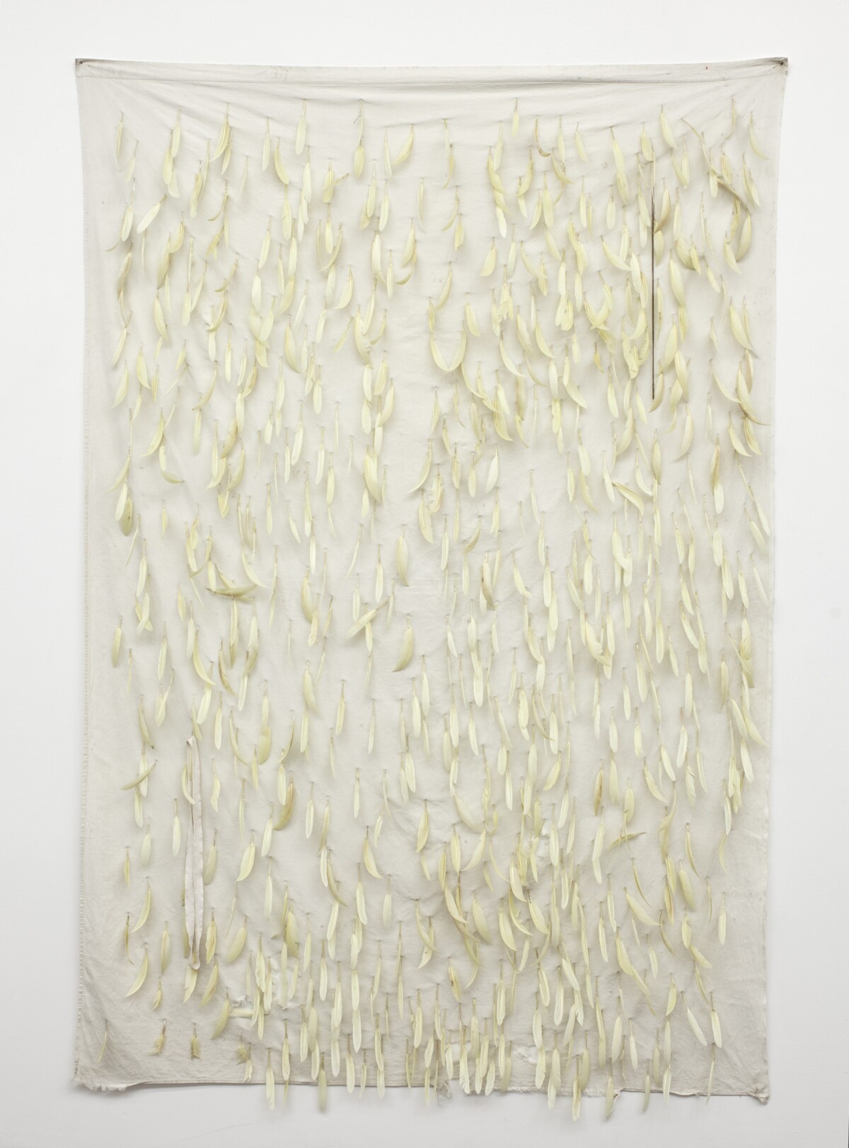 2015-2016 Sábana, plumas, tela, cadenita 243 x 153 cm