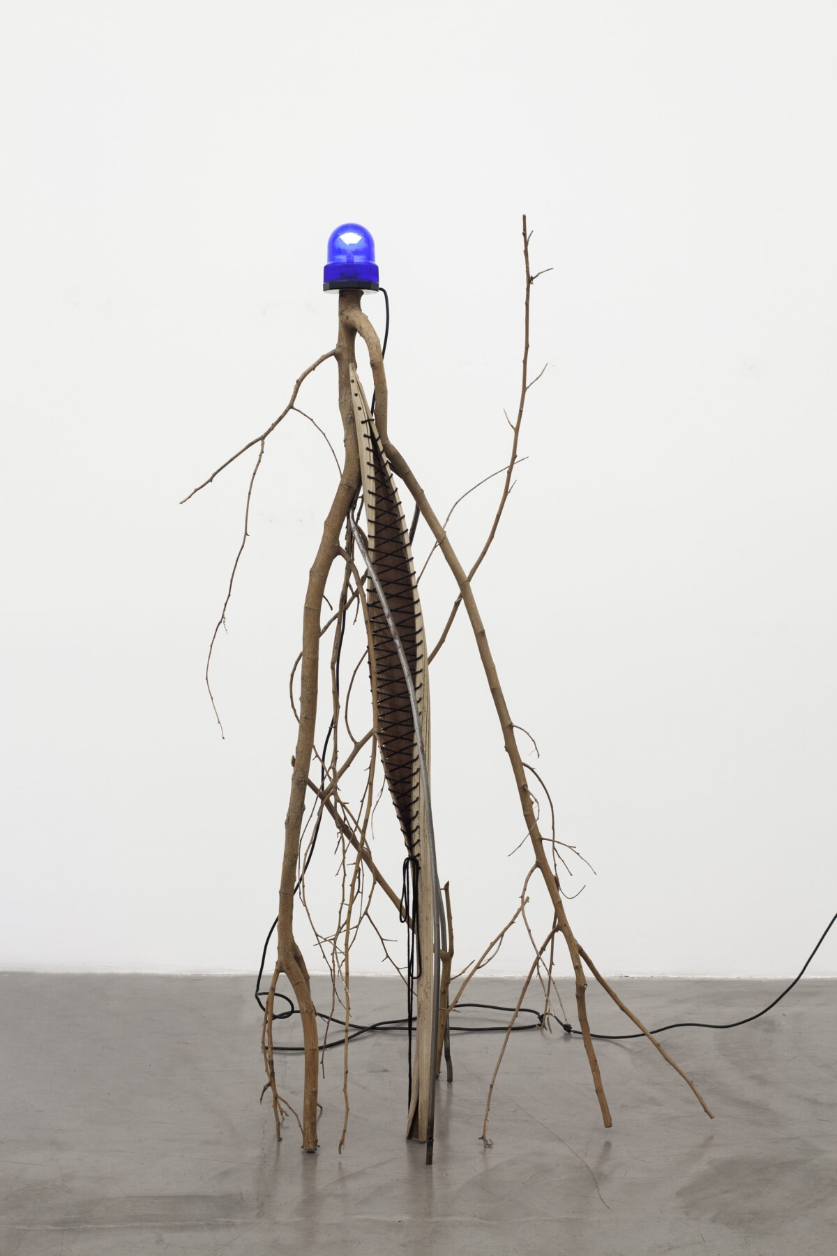 2018 Rama, hierro, vaina vegetal y cordón negro, baliza giratoria con luz led 195 x 50 x 50 cm.