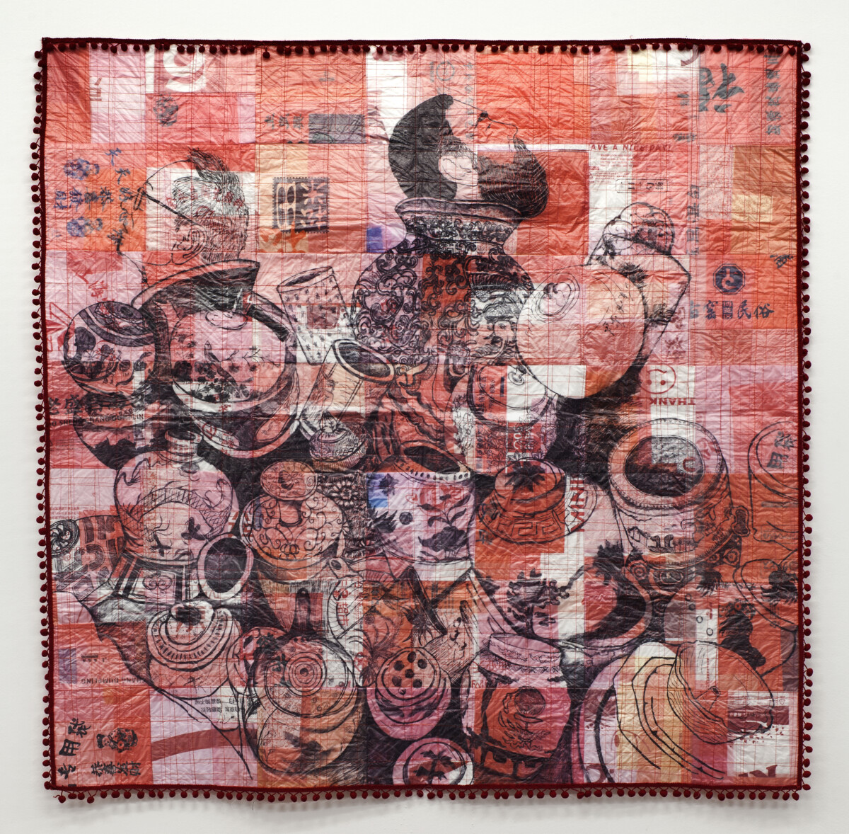 2018 Patchwork con bolsas de plástico s/tela y marcador indeleble, guirnalda de algodón Patchwork with plastic bags on fabric and permanent marker, cotton garland 130 x 130 cm (Disponible)