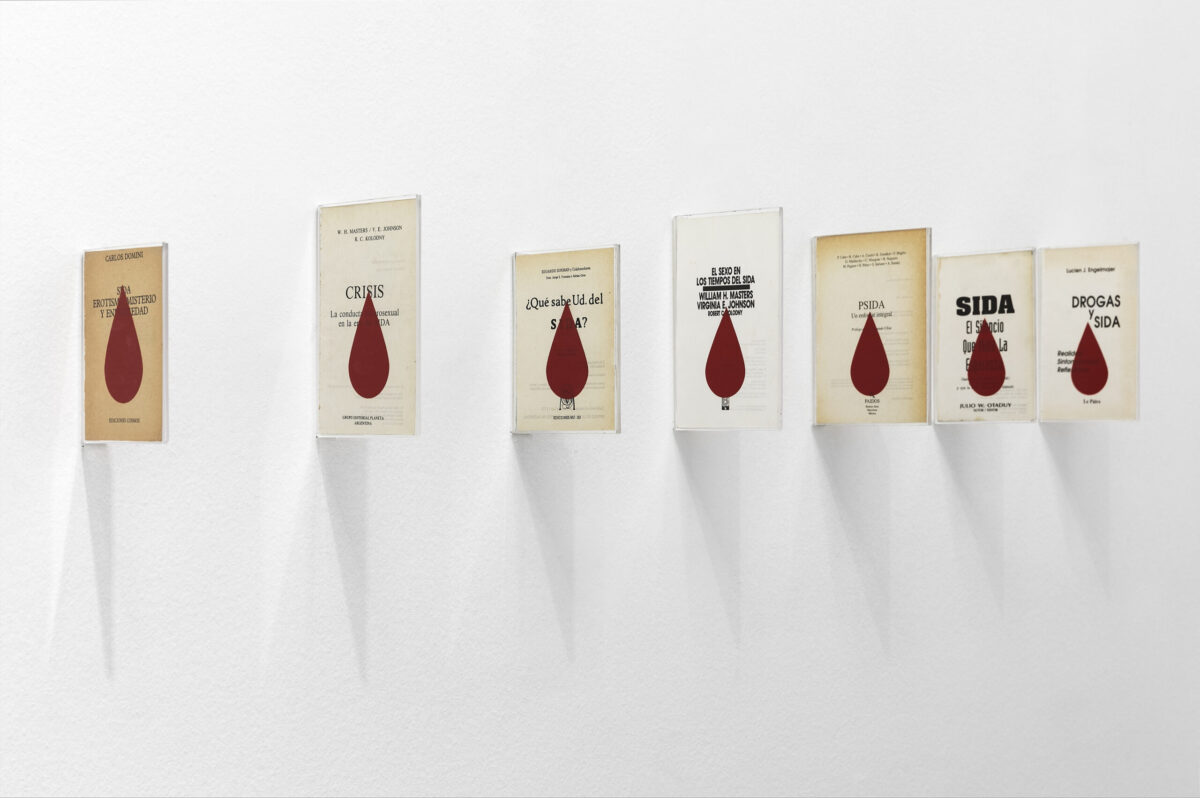 1998 Páginas de libro intervenidas con vinilo de corte rojo
