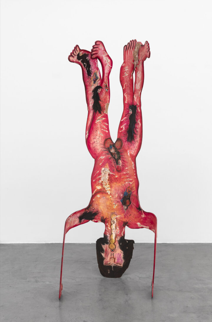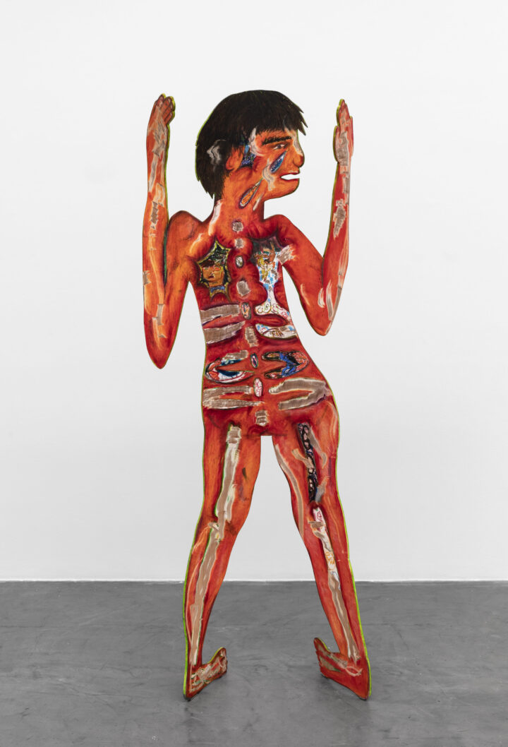 Ulises Mazzucca siempre insiste. Insiste en la grafía que no es línea sino incisión, hendidura sobre la superficie que vandaliza el plano y multiplica los escenarios. Escenas de miedo, pesadilla, fantasía, mil cuentos, algunos vicios, magia en el cuarto, oscuridades de ático, desgarro, soledad y compañía. Mazzucca insiste en su propio cuerpo, pero es él y no es él. Si yo tuviera que buscar un giro para expresarlo con precisión, diría que son los pibes. Aunque también podría decir que son las pibas. O quienes resisten los géneros o los intercambian. Y cerraría la frase con un verso del poeta marica Miguel Ángel Lens: movidos por la “dulce prisa de gozar”. La grafía de Mazzucca no se detiene, siempre busca nuevas superficies que profanar, no sabe hacerlo de otro modo. Por eso esta muestra vuelve sobre lo que en realidad recorre todo su trabajo. La insistencia del trazo, que puede ser escritura o dibujo, se mueve acompasando la respiración, late, hace silencio y vuelve a lanzarse. En el centro están los cuerpos, que también es su cuerpo. Y todos los accidentes que se producen en contacto con el mundo. Gran parte de estos accidentes son las peripecias del amor y del sexo. Que son celebración, pero también herida. Parece contradictorio que teniendo tantas cosas de las que ocuparse también piense en esto. Aquí vuelve a coincidir con Lens: “recupero la fiesta de tus ojos y regreso hacia mí mismo más triste que nunca”. En este último momento de su obra la conmoción de ese cuerpo, de esos cuerpos, avanza retorciendo la madera aún más, encontrando más huecos, desgarrando el pastel, esfumando la veta del árbol con suaves transparencias, horadando intestinos de colores iridiscentes, multiplicando las superficies en las que volver a rasgar. Esa escritura plebeya, que nació en la puerta de un baño, fue construyendo un universo que ahora se pliega sobre la propia piel. Y lo hace sin escatimar contrastes, riqueza, brillo. Un lujo que, paradójicamente, parte de la crudeza. Ahora en la sala podemos ver a todas estas figuras retorciéndose, paradas de manos, saltando, corriendo, arrodillándose, en cuclillas, gritando, jugando. Fue necesario contorsionar el plano pictórico para hacer lugar a sus conmociones, su peso y su levedad. Se deslizan hasta codearse con el estatuto escultórico. Me gustaría que se detengan frente al espectáculo de las líneas que dibujan en el aire sus contornos. Que observen como esa grafía volvió a apoderarse del espacio en una mayor escala. Luego, vuelvan a acercarse a ellas y mírenlas de cerca. Aproxí mense a su piel. Piel que es memoria del goce y de las faltas. Hace poco Mazzucca tituló una obra: El suplicio de lxs que perdimos todo. Allí evocó algo de su historia. Es la falta en tanto carencia y necesidad, no sólo material, sino de amparo, de apoyo, de hacer falta, la tristeza sociológica de los pibes. Falta que también es incumplimiento, decepcionar la expectativa que, sutilmente, se había señalado como el único camino posible. Por eso la falta puede ser desobediencia y desacuerdo. O una pequeña jugarreta, emboscada del débil para disfrutar donde no se lo permiten, una simple falta en el colegio. Ulises es Ulises, pero no es sólo él. Es la muestra de esa belleza caleidoscópica, de esa capacidad infinita de contar, de ese dolor y picardía de todos esos pibes y pibas que nos hacen falta. Es la belleza que aparece allí donde no se la esperaba, donde se hizo todo por extinguirla, por lacerarla. Y sin embargo, a pesar de todo, está ahí. La mueve esa falta que tantas veces marcó las entrañas, pero también la impulsa un deseo que desafía el peso del mundo.