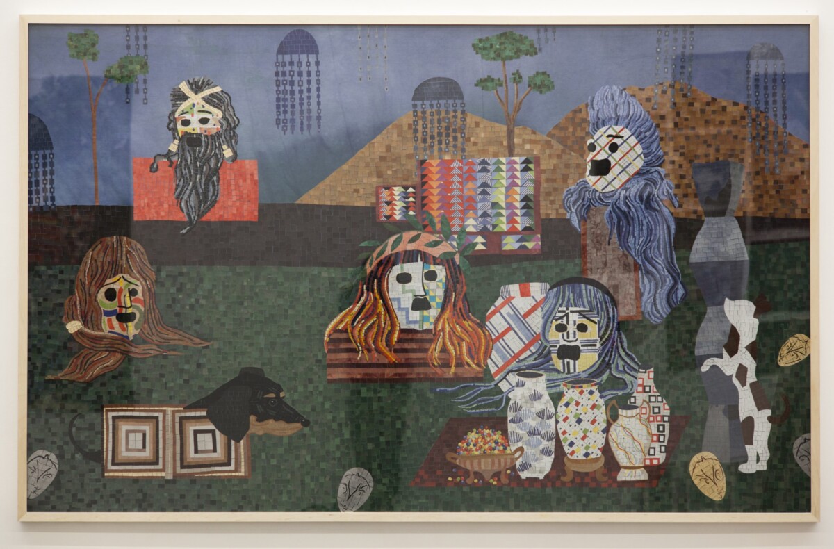 2017 Mosaico textil y jarrón con pie de metal 158 x 250 cm