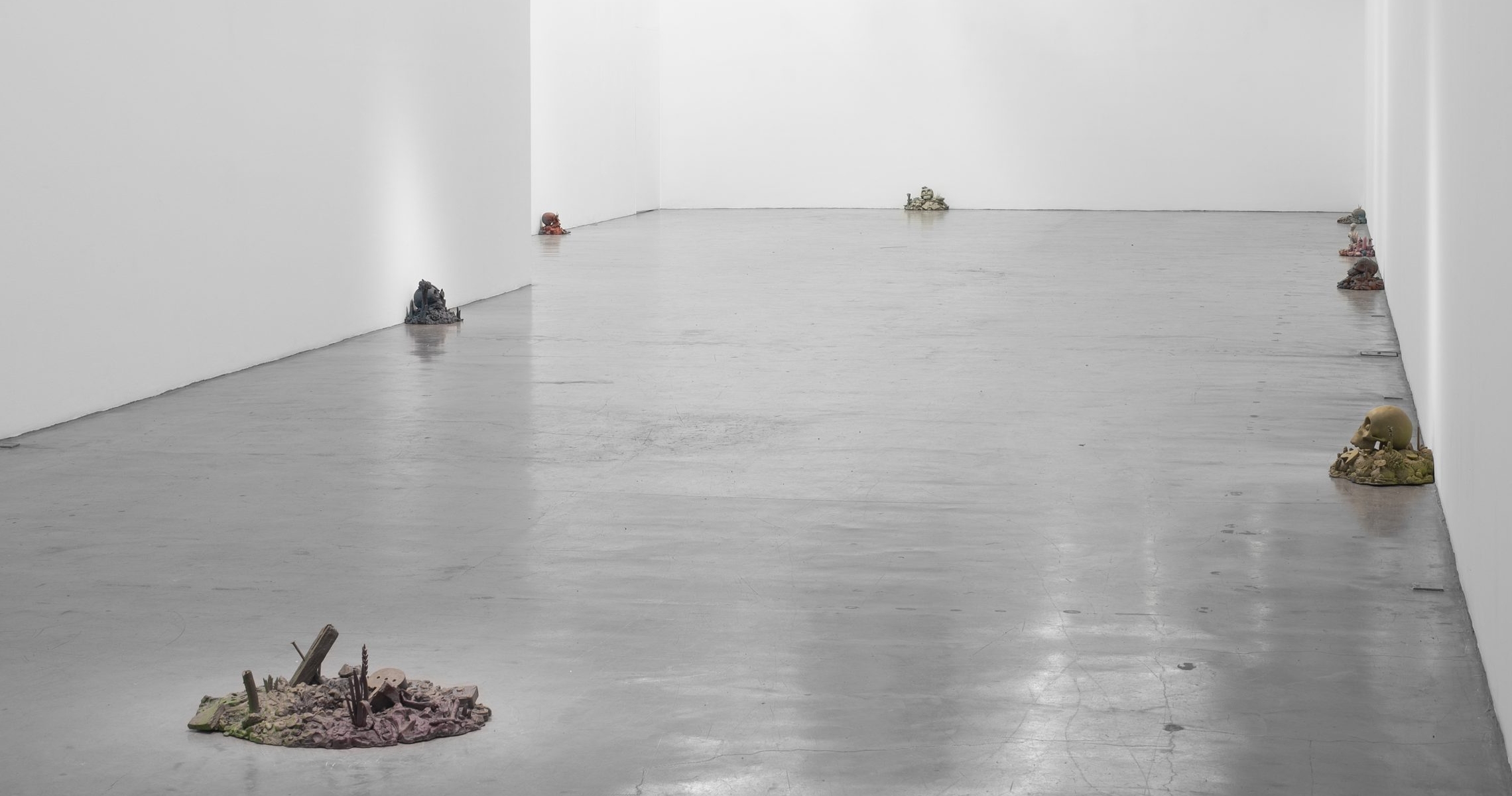 Las nueve piezas de aluminio son una interpretación tridimensional de una serie de pinturas del artista: en ellas un rostro todavía humano que se encuentra en un estado de superposición entre la vida y la muerte se asoma sobre la superficie de un montículo de tierra para entregar un mensaje aparentemente paradojal, que al ser inspeccionado revela aspectos polisémicos. Las nuevas esculturas buscan generar un ensamblaje de texturas y modos constructivos mediante un proceso que incluyó herramientas de realidad virtual, impresión 3D, modelado escultórico tradicional en diversos materiales y objetos encontrados. El objeto final, íntegramente hecho en aluminio y posteriormente policromado con pintura al óleo, se realizó utilizando una adaptación de las técnicas usadas en la fundición de bronce.